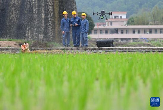 3月28日,在广东云浮罗定市长岗坡,蓝誉鑫(中)和同事操控无人机起飞巡线。
